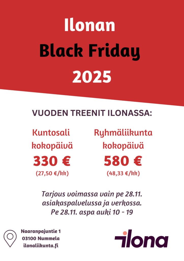 Lisäksi Black Fridayn kunniaksi perjantaina 28.11. AVOIMET OVET päivän tunneille sekä kuntosalille 10:00-19:00 + kahvitarjoilu! Tervetuloa tutustumaan ja treenaamaan! Tunneille tulee ilmoittautua etukäteen (info@ilonaliikunta.fi tai https://oma.enkora.fi/ilonaliikunta/reservations2/)