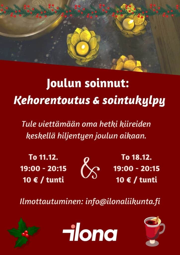 Tule rentoutumaan joulun aikaan ihanalle kehorentoutus ja sointukylpy tunnille. Tuntien jälkeen glögitarjoilu.